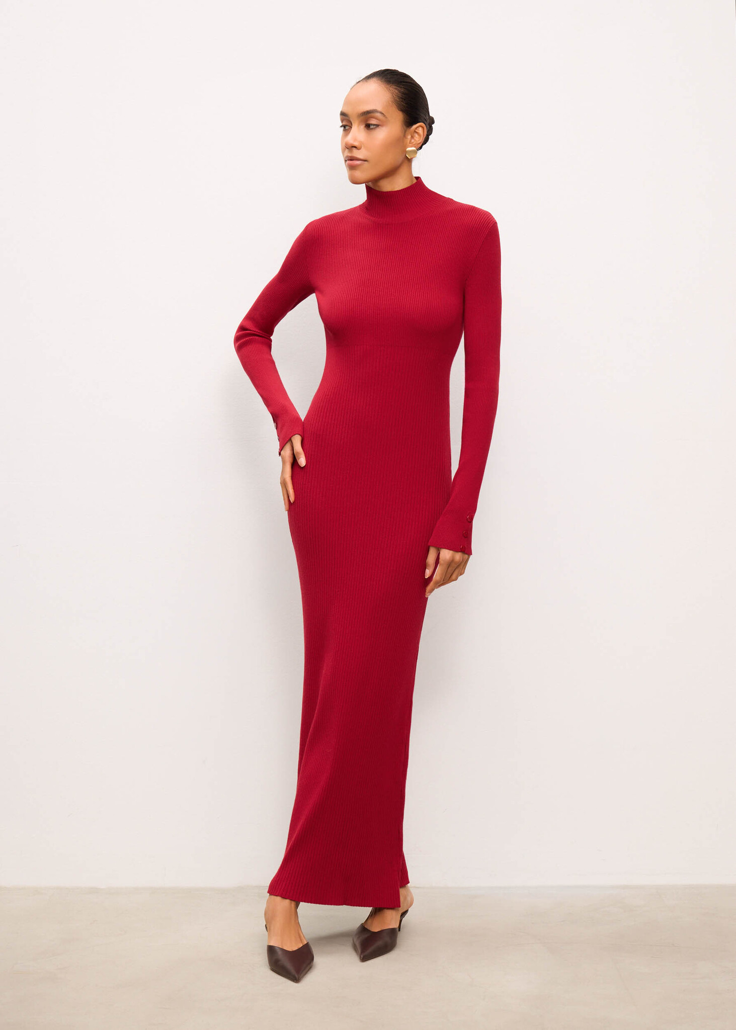 Женственность и практичность объединились в этом платье. Мы сделали все, чтобы в нем было комфортно провести весь день, насыщенный планами и событиями. Минимализм, актуальный в любой сезон, и множество лаконичных деталей: облегающий силуэт, пуговицы на удлиненных рукавах, низкий воротник-стойка, фактурная вязка. Эластичная пряжа помогает посадить платье точно по фигуре.
